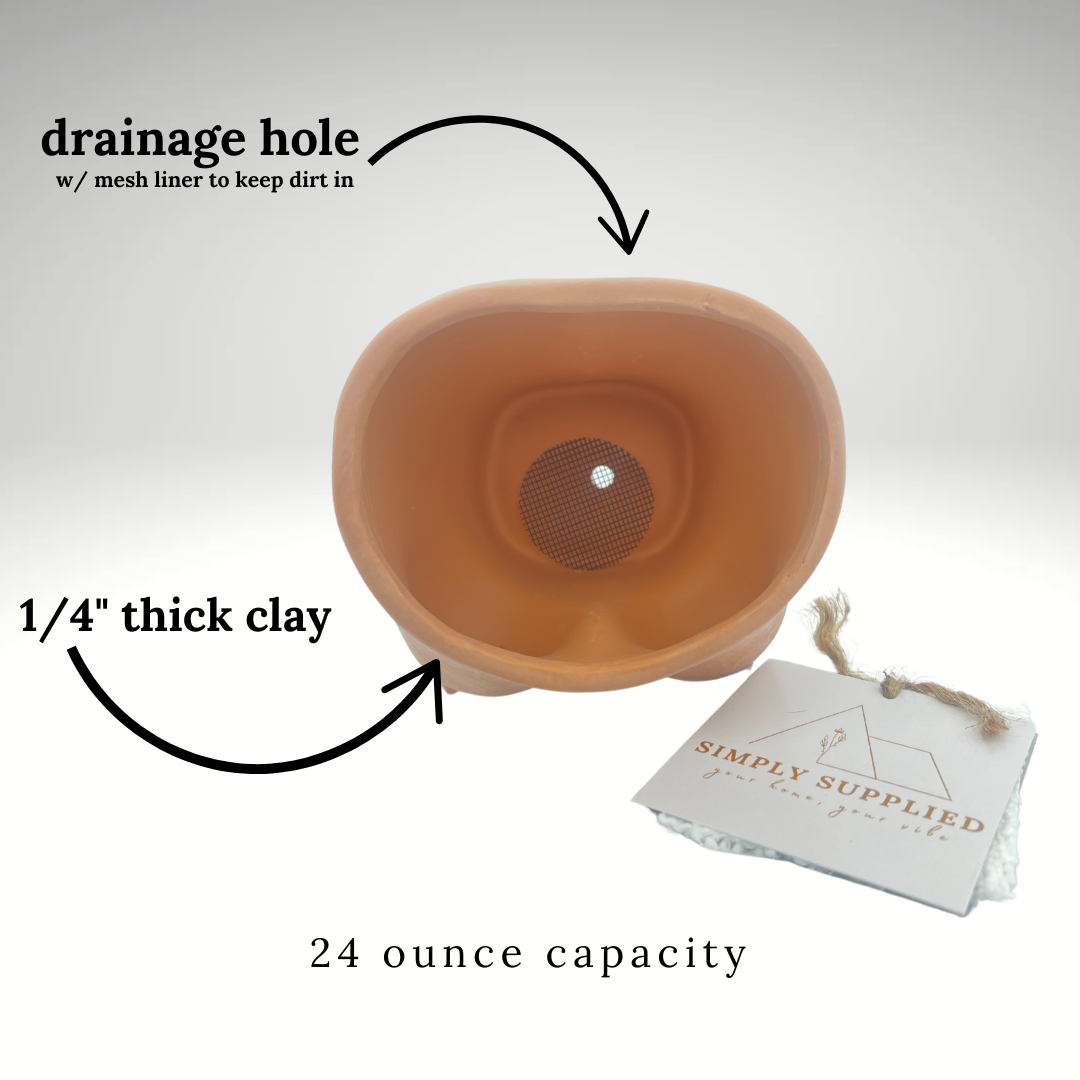 Our Terracotta Planters are all made of pure clay, fired low and slow to prevent cracking and then lightly coated with a matte milk paint to add dimension. All pots come with a drainage hole, and a mesh pad to prevent dirt from falling out of the bottom.